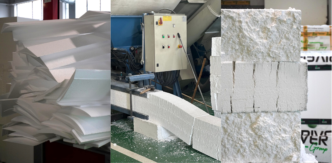 Il materiale viene triturato e trasformato in r-EPS, attraverso compattazione o granulazione.