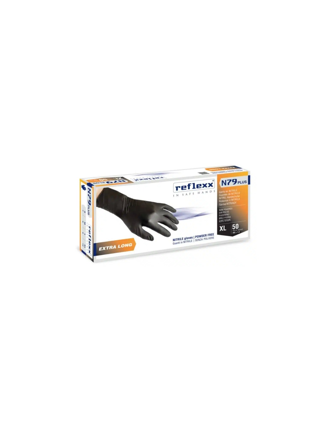 Reflexx N79 nitrile senza polvere NERIPeso/Weight 7,7 gr. - Spess./Thick. 0,14 mm.- imballo 10 cf da 50 pz -